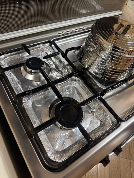 قسمت میانی فویل سوراخی ایجاد شده برای جای گرفتن پایه شعله پخش کن اجاق که در صورت نیاز می توانید با کمی برش ، سایز آن را به میزان دلخواه افزایش دهید .