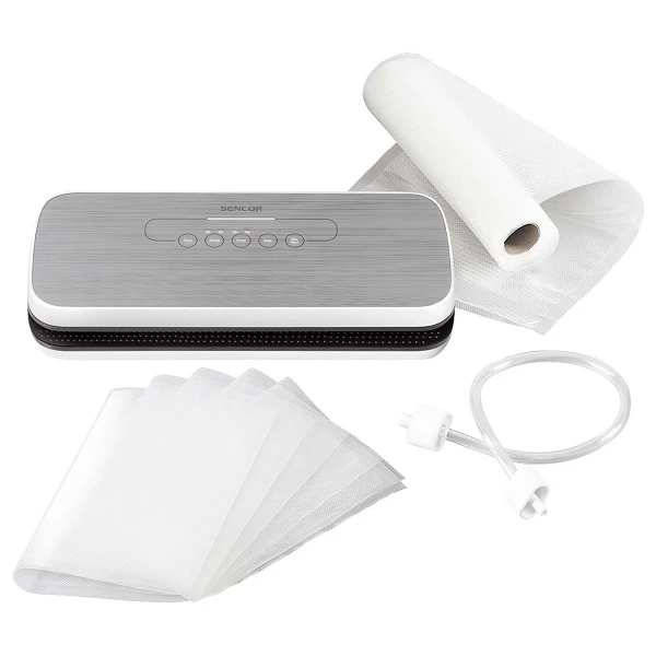 دستگاه وکیوم سنکور مدل SVS3010GY به همراه لوازم جانبی شامل یک شلنگ خلاء، پنج عدد کیسه بستهبندی به ابعاد 30×20 سانتیمتر و یک رول مخصوص بستهبندی به اندازه 200×20 سانتیمتر عرضه میشود