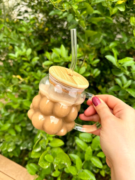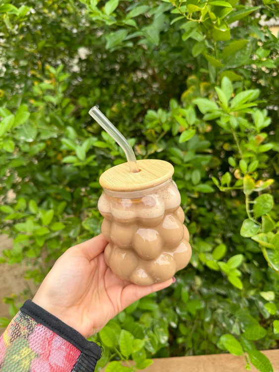 لیوان اسموتی حبابی bubble 🫧همراه با درب بامبو و نی پیرکس