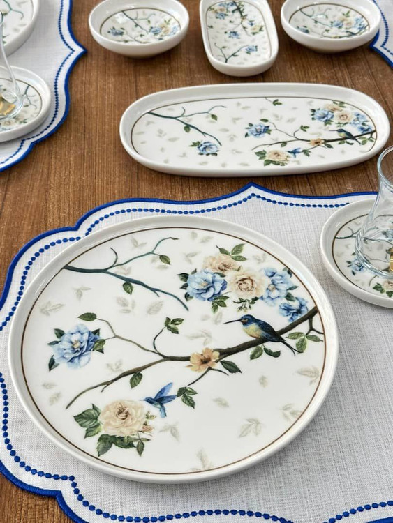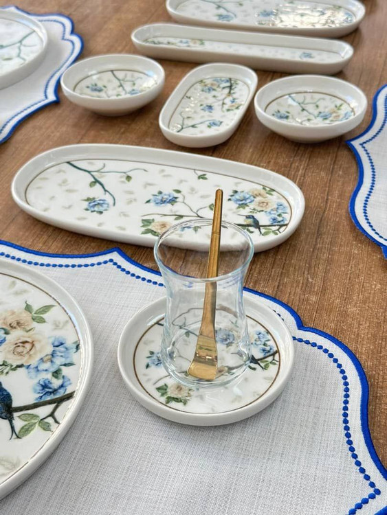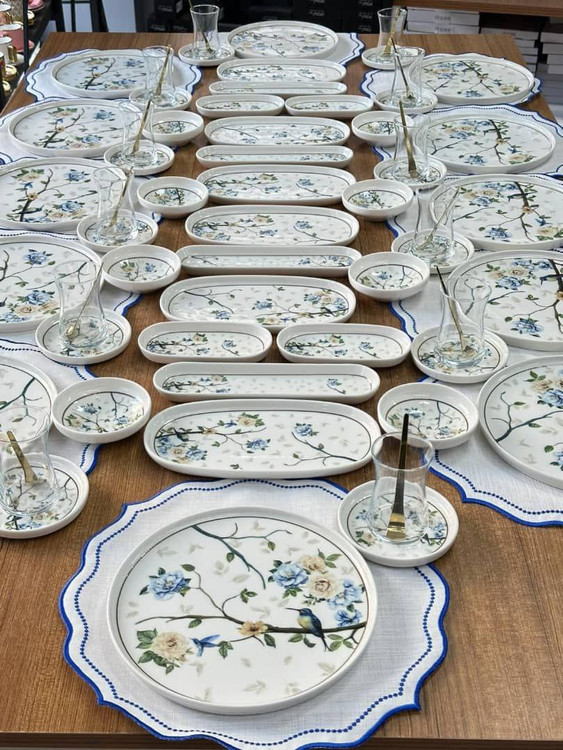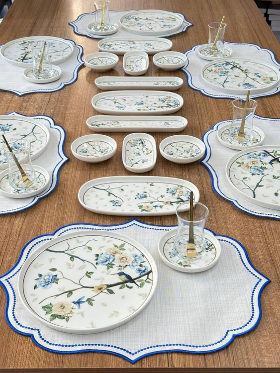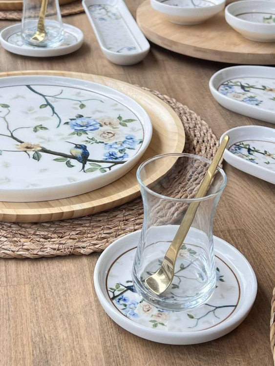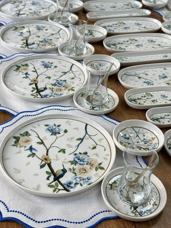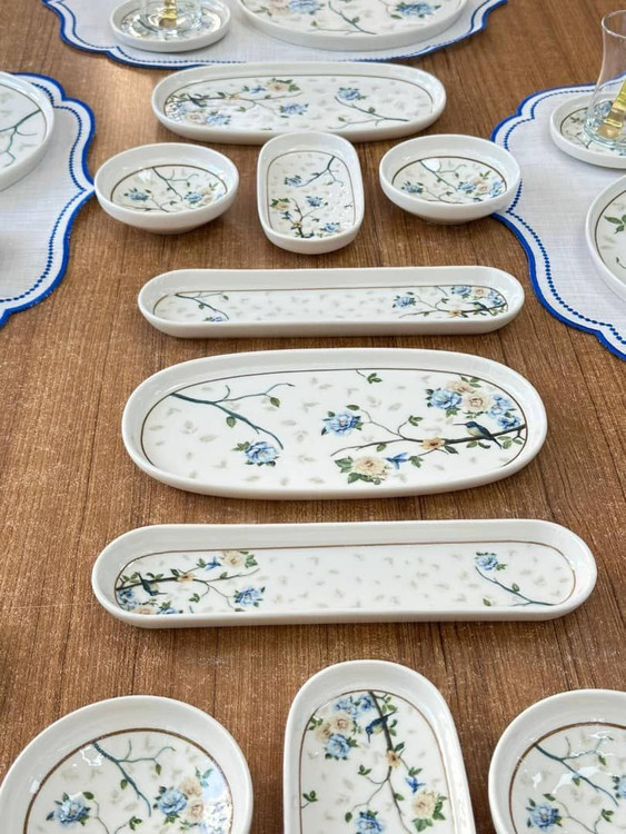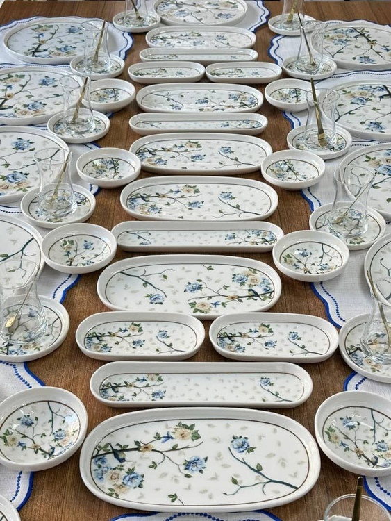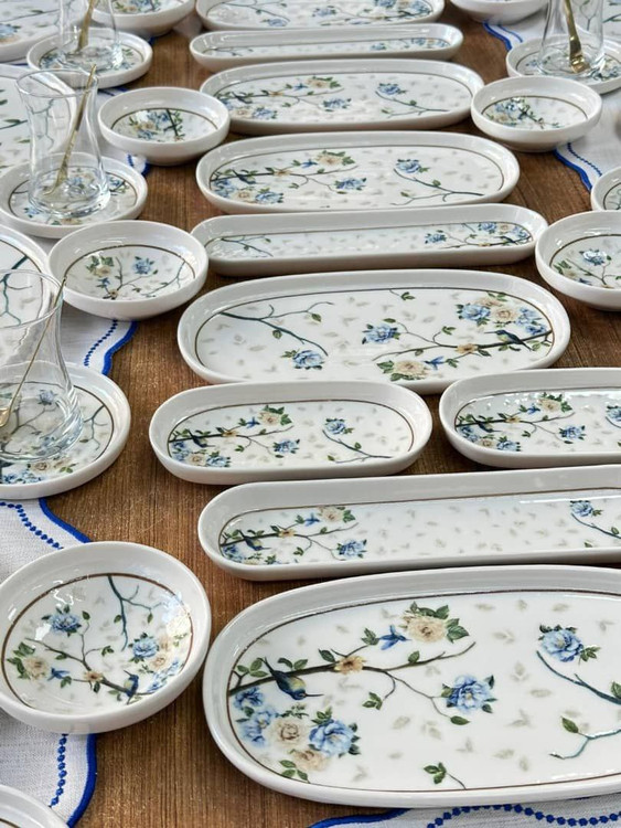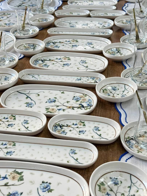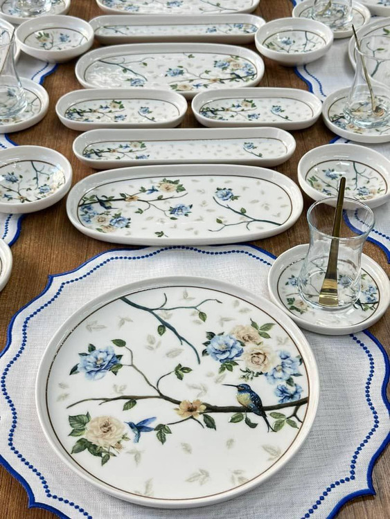 ست شامل: 6 عدد بشقاب 24 سانتی / 6 عدد استکان / 6 عدد نعلبکی 11 سانتی / 4 عدد پیاله 10 سانتی / 3 عدد دیس بیضی 25*13 سانتی / 2 عدد دیس قایقی 16*8 سانتی / 2 عدد دیس قایقی 20*11 سانتی