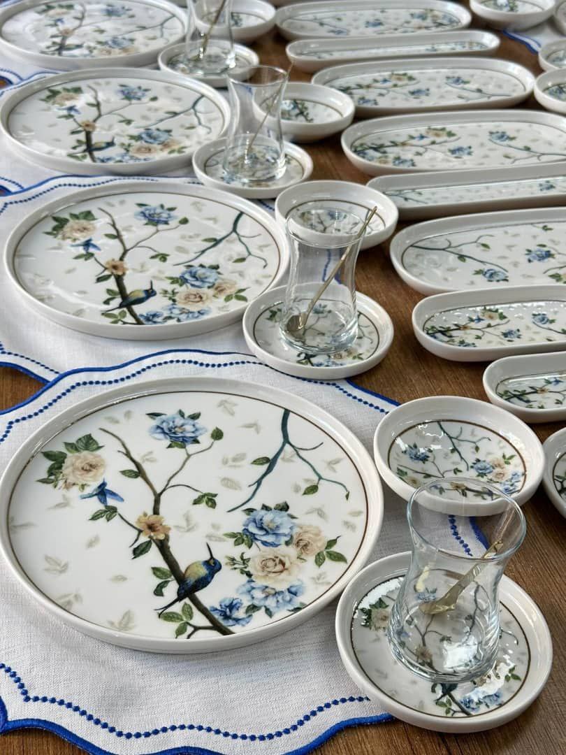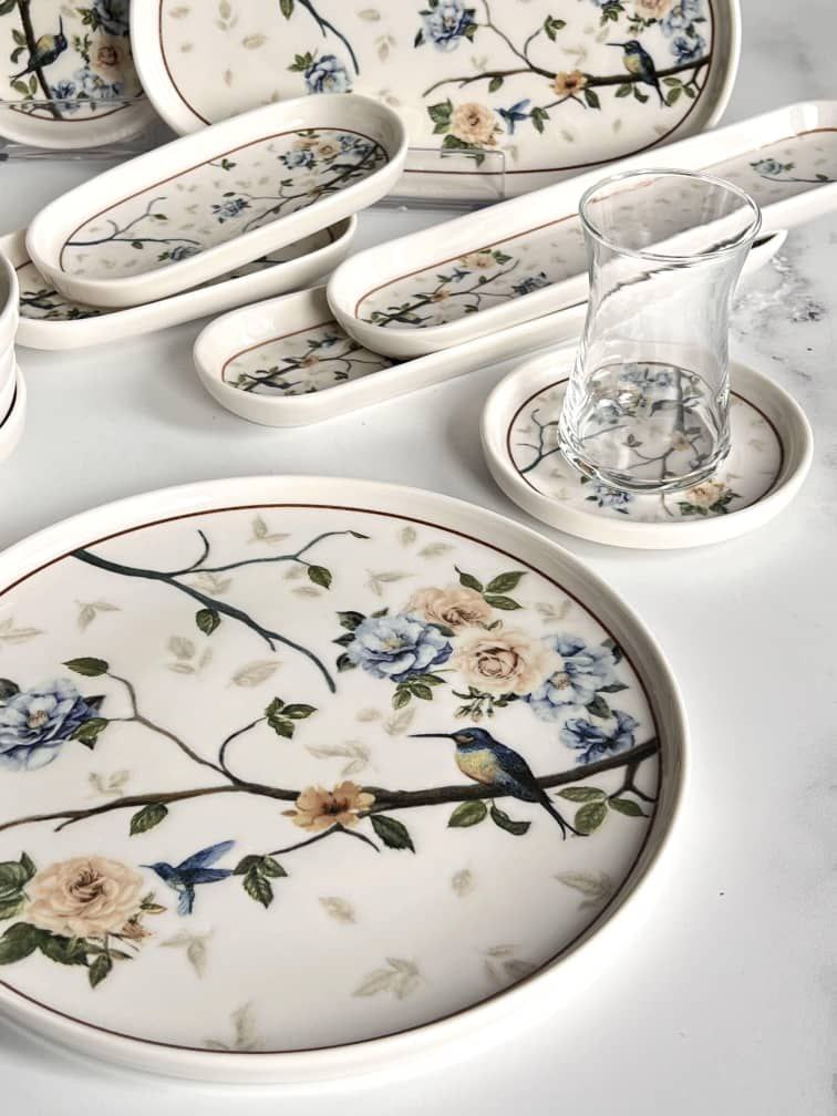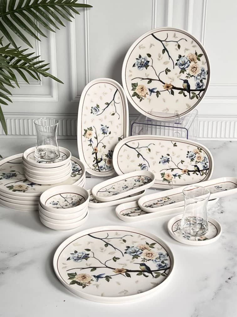 ست شامل: 6 عدد بشقاب 24 سانتی / 6 عدد استکان / 6 عدد نعلبکی 11 سانتی / 4 عدد پیاله 10 سانتی / 3 عدد دیس بیضی 25*13 سانتی / 2 عدد دیس قایقی 16*8 سانتی / 2 عدد دیس قایقی 20*11 سانتی