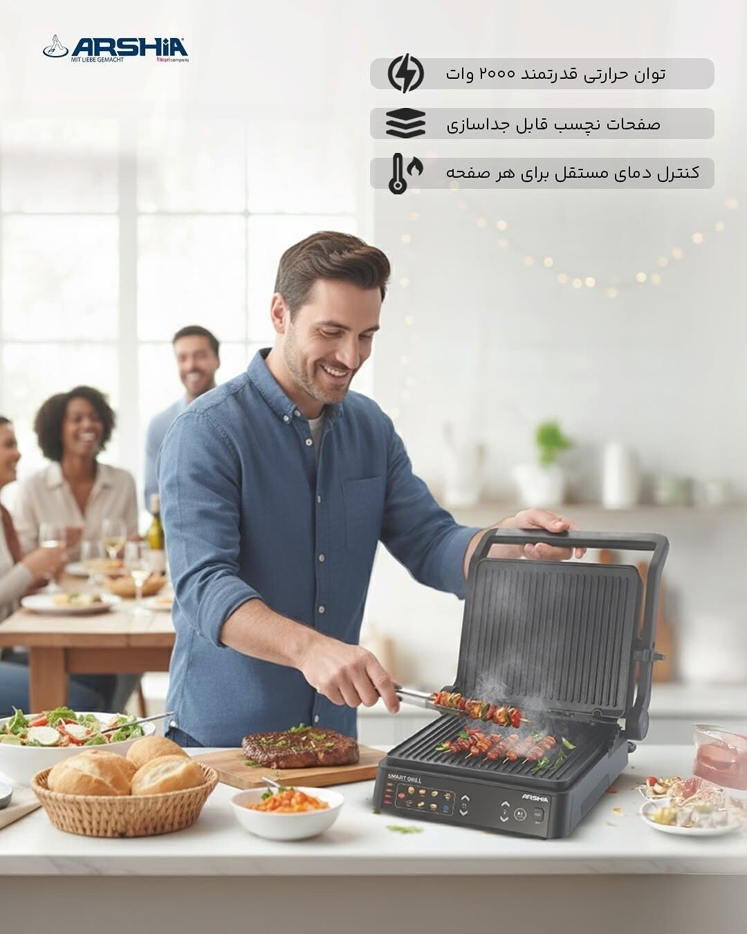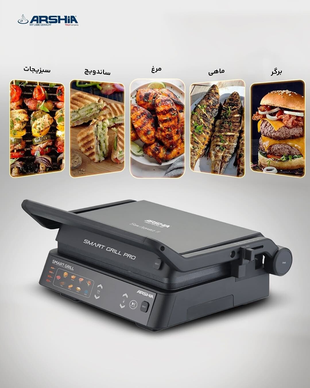 گریل عرشیا مدل SG278-3418 دارای طراحی چندمنظوره است که میتواند از گریل تکی تا گریل باز با صفحات نچسب قابل جدا شدن را پشتیبانی کند.