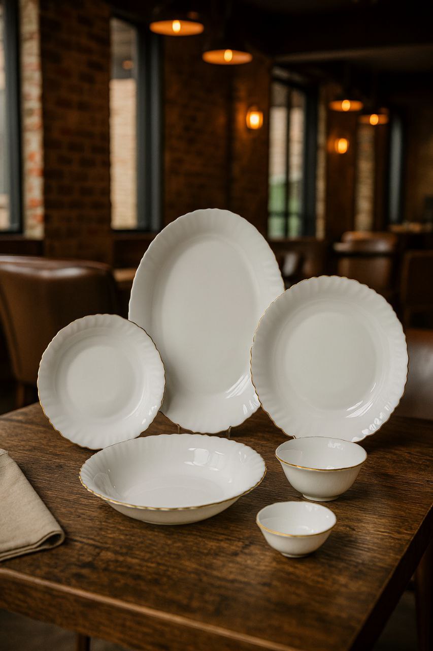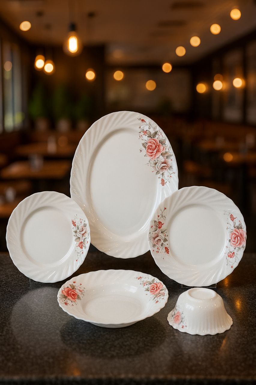 ست شامل: ۶ پلوخوری / ۶ خورشتی / ۶ پیشدستی / ۶ پیاله / ۱ دیس بزرگ