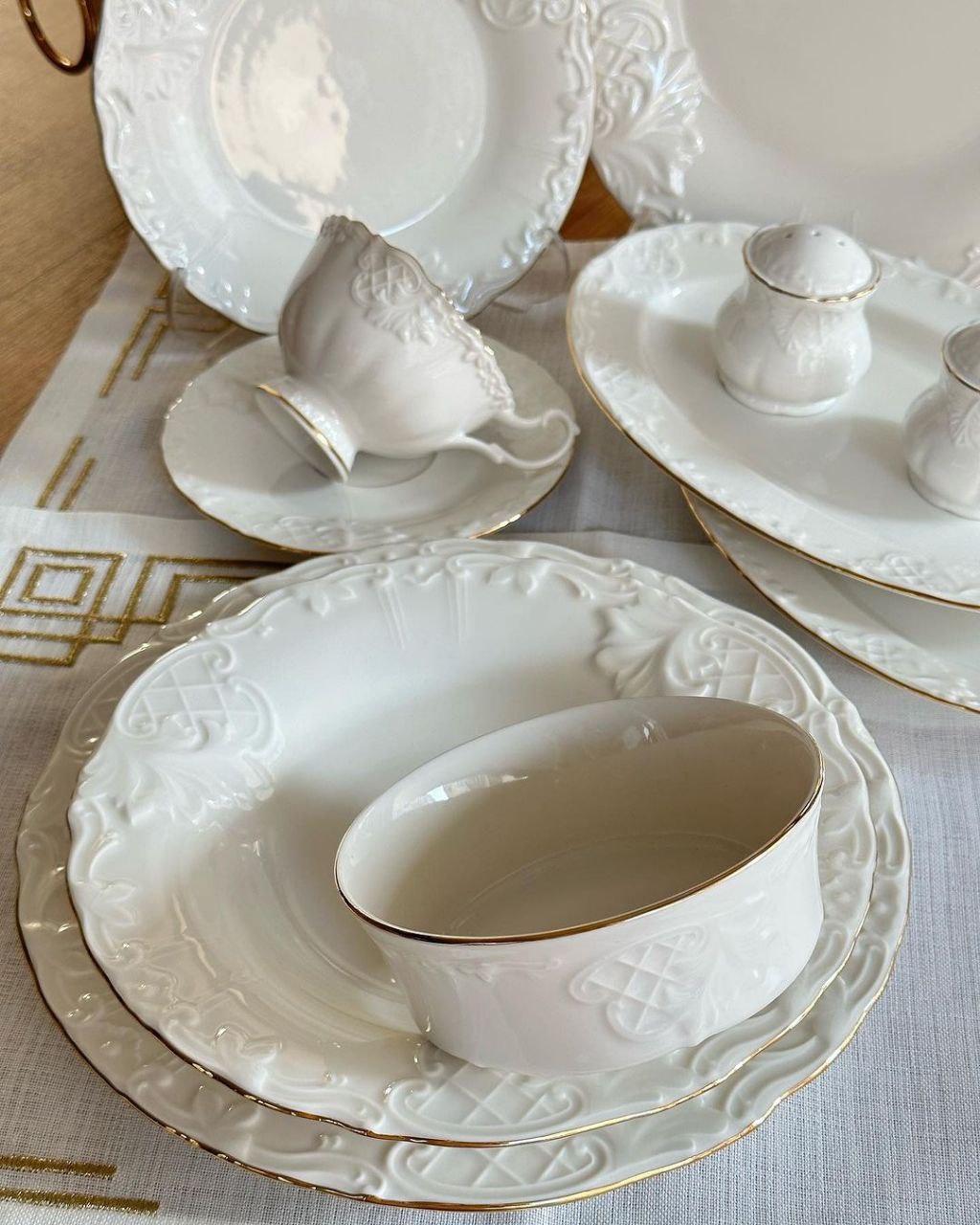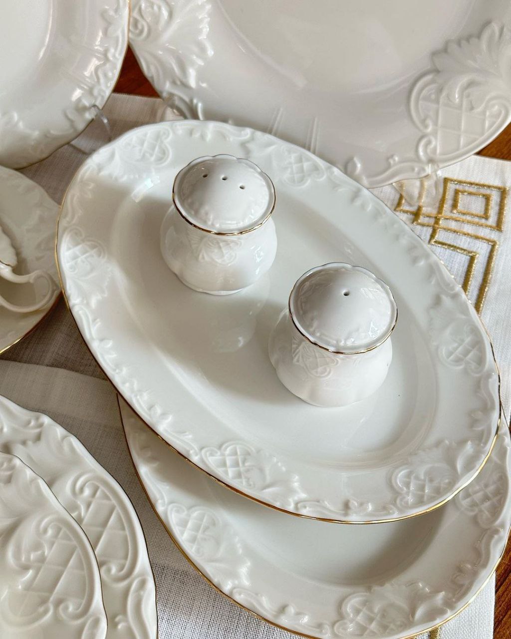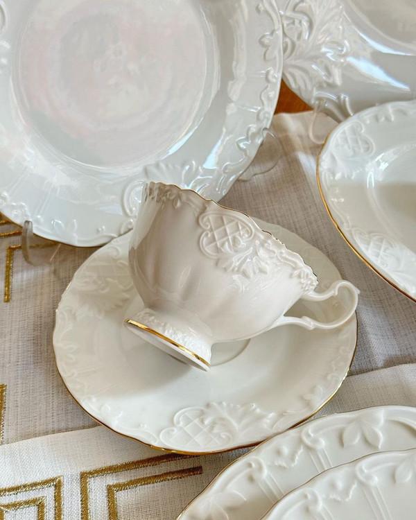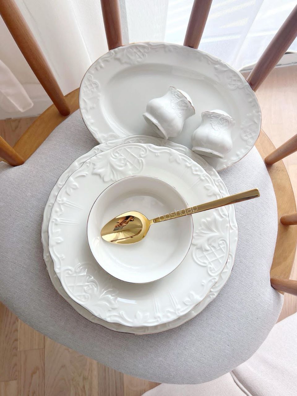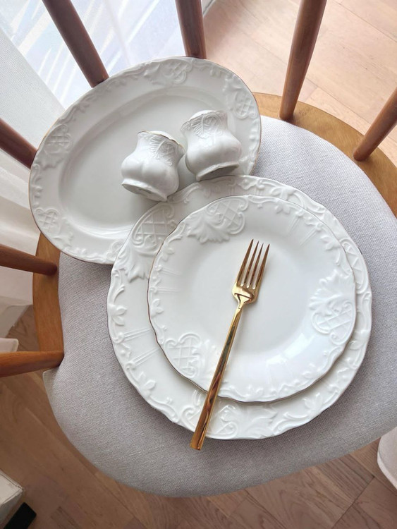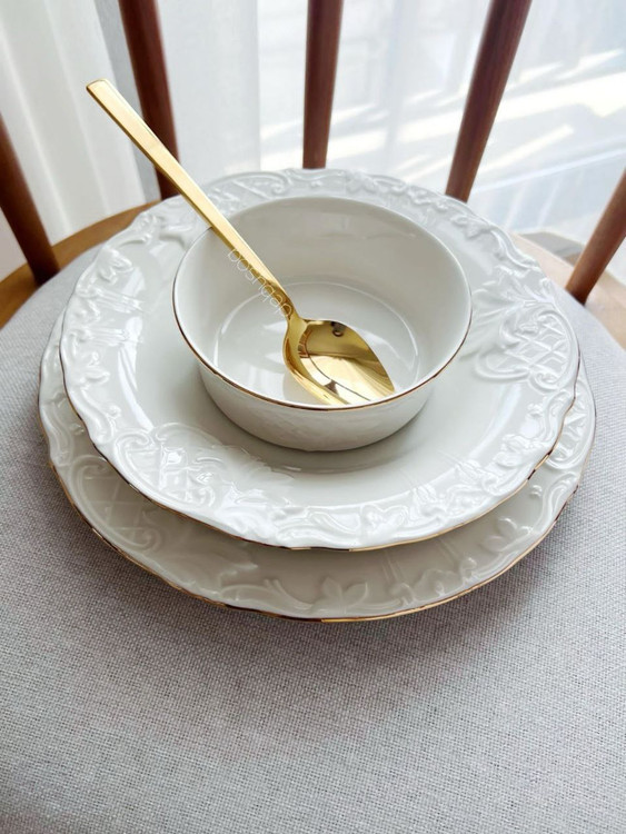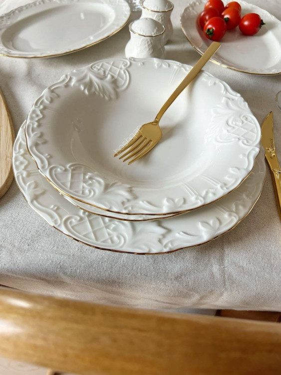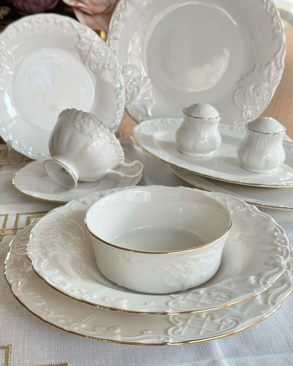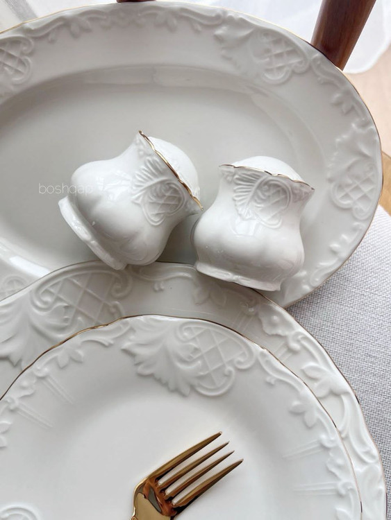 ست شامل: 6 عدد پلو خوری / 6 عدد پیش دستی / 6 عدد خورشت خوری / 6 عدد پیاله / 2 عدد نمکدون و فلفل / 2 عدد دیس