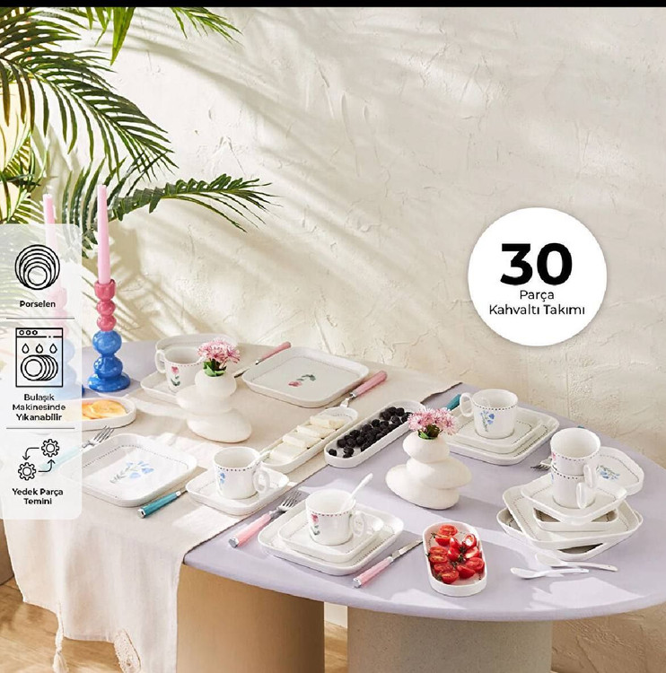 ست شامل: ۶ عدد سرویستابق ۱۹cm / ۶ عدد فنجان چای ۲۲۰ml / ۶ عدد نعلبکی / ۶ عدد قاشق چای / ۲ عدد سرویستابق ۲۰cm / ۲ عدد ظرف زیتون ۲۵cm / ۲ عدد سرویستابق ۱۵cm