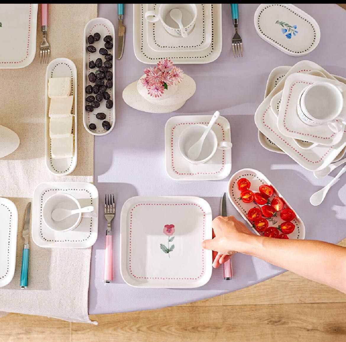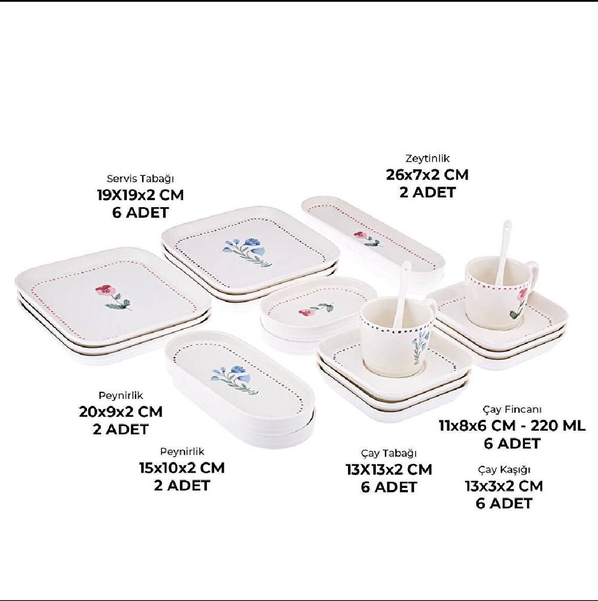 ست شامل: ۶ عدد سرویستابق ۱۹cm / ۶ عدد فنجان چای ۲۲۰ml / ۶ عدد نعلبکی / ۶ عدد قاشق چای / ۲ عدد سرویستابق ۲۰cm / ۲ عدد ظرف زیتون ۲۵cm / ۲ عدد سرویستابق ۱۵cm