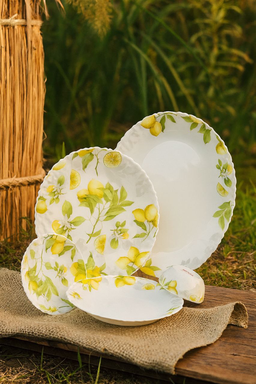ست شامل: ۶ عدد پلوخوری / ۶ عدد خورشتی / ۶ عدد پیشدستی / ۶ عدد پیاله / ۱ عدد دیس بزرگ