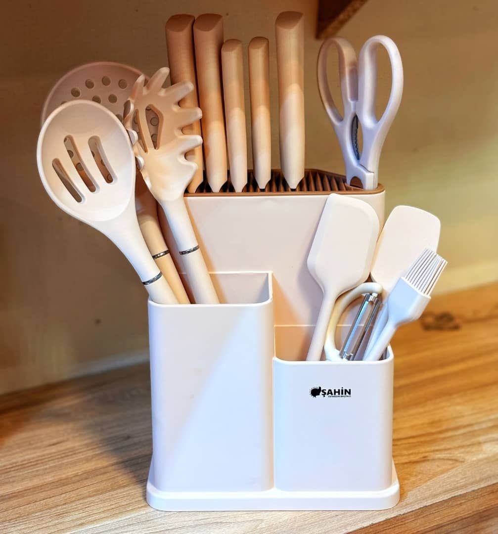 ست ۱۴ پارچه چاقو ، کفگیر ملاقه طرح Ladin برند Şahin 4 عدد چاقو / 3 عدد کفگیر ملاقه / 1 عدد قیچی / 2 عدد لیسک / 1 عدد فرچه / 1 عدد پوست کن/ 1 عدد استند