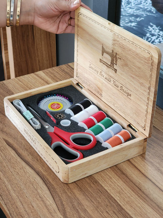 جعبه شامل: شش قرقره رنگی / یک بسته سوزن / یک عدد متر / یک عدد انگشتانه / قیچی / یک بسته سورن ته گرد / ماسوره