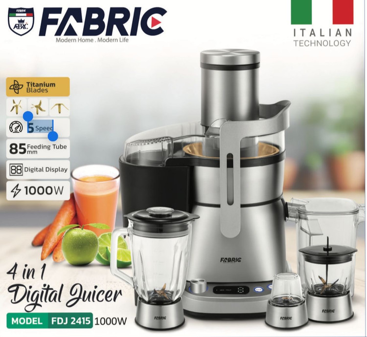 آبمیوه گیری 4 کاره فابریک 2415 دارای 4 عملکرد آبمیوه گیر ، مخلوط کن ، آسیاب ، و خوردکن میباشد . یک متور تمام مسی 1000 وات واقعی روی دستگاه تعبیه شده که قدرت بی نظیری در انجام دادن وظایف خود دارد .