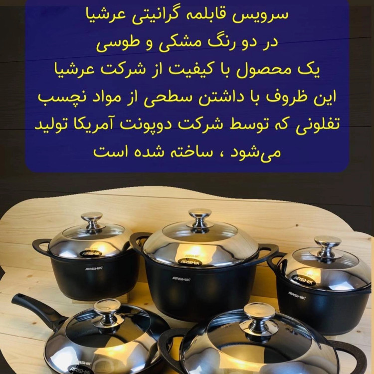 ✅ظروف آشپزی عرشیا با داشتن سطحی از مواد نچسب تفلونی که توسط شرکت دوپونت آمریکا تولید میشود ، ساخته شده است
