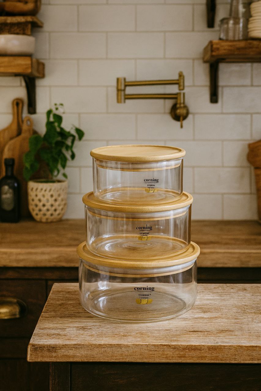 ظرف نگهدارنده پیرکس گرد درب بامبو سه تکه